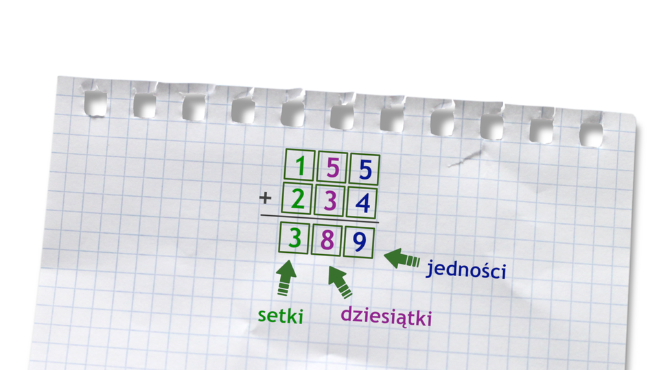 Na kartce w kratkę przedstawiono dwa działania dodawania wykonane sposobem pisemnym. Po lewej stronie zapisano liczbę dwa tysiące pięćset trzydzieści cztery tak, że każda cyfra znajduje się w oddzielnym kwadratowym polu. Pod nią zapisaną liczbę sto sześćdziesiąt dwa, tak, że każda cyfra znajduje się w oddzielnym kwadratowym polu. Dodatkowo cyfry setek, dziesiątek i jedności znajdują się jedna pod drugą, czyli odpowiednio cyfra pięć znajduje się nad cyfra jeden, cyfra trzy znajduje się nad cyfrą sześć oraz cyfra cztery znajduje się nad cyfrą dwa. Oddzielamy dwie liczby poziomą kreską pod którą zapiszemy wynik. Dokonujemy dodawania w każdej kolumnie zaczynając od prawej strony w następujący sposób: Jeden kolumna jedności: cztery plus dwa daje w sumie sześć i liczbę tę wpisujemy jako cyfrę jedności szukanego wyniku. Dwa kolumna dziesiątek: trzy dodać sześć daje w sumie dziewięć co zapisujemy jako cyfrę dziesiątek szukanego wyniku. Trzy kolumna setek: pięć plus jeden daje w sumie sześć do zapisujemy jako cyfrę setek szukanego wyniku. Cztery kolumna tysięcy. w niej znajduje się jedynie cyfra dwa więc przepisujemy ją jako cyfrę tysięcy szukanego wyniku. Wówczas wynik to dwa tysiące sześćset dziewięćdziesiąt sześć. Każda z cyfr zapisana jest w osobnym kwadratowym polu. Po prawej stronie zapisano liczbę piętnaście tysięcy sto dwadzieścia dziewięć tak, że każda cyfra znajduje się w oddzielnym kwadratowym polu. Pod nią zapisano liczbę czterysta czterdzieści trzy tak, że każda cyfra znajduje się w oddzielnym kwadratowym polu. Pod nią zapisano liczbę tysiąc dwieście dziewięćdziesiąt dwa i tak samo każda cyfra znajduje się w oddzielnym kwadratowym polu. Dodatkowo cyfry tysięcy, setek, dziesiątek i jedności znajdują się jedna pod drugą, czyli odpowiednie pod piątką znajduje się jedynka należąca do trzeciej liczby, pod jedynką znajduje się czwórka, a jeszcze niżej dwójka, pod dwójką znajduje się czwórka a jeszcze niżej dziewiątka, pod dziewiątką znajduje się trójka, a jeszcze niżej dwójka. Oddzielamy trzy liczby poziomą kreską, pod którą zapiszemy wynik. Dokonujemy dodawania w każdej kolumnie zaczynając od prawej strony w następujący sposób: Jeden kolumna jedności: dziewięć plus trzy plus dwa daje w sumie czternaście, cyfrę jedności liczby czternaście zapisujemy jako cyfrę jedności szukanego wyniku a liczbę dziesiątek czyli jeden zapisujemy nad kolumną cyfr dziesiątek. Dwa kolumna dziesiątek: jeden plus dwa plus cztery plus dziewięć daje w sumie szesnaście. Cyfra jedności liczby szesnaście jest cyfrą dziesiątek szukanego wyniku, liczba dziesiątek, czyli jeden zapisujemy na kolumna liczby setek. Trzy. kolumna cyfr setek, jeden plus jeden plus cztery plus dwa daje w sumie osiem co zapisujemy jako cyfrę setek szukanego wyniku. Cztery kolumna tysięcy pięć plus jeden daje w sumie sześć co zapisujemy jako cyfrę tysięcy szukanego wyniku. pięć kolumna dziesiątek tysięcy w niej znajduje się jedynie cyfra jeden która jest przepisana jako cyfra dziesiątek tysięcy w szukanym wyniku. Wówczas wynik to szesnaście tysięcy osiemset sześćdziesiąt cztery . każda z cyfr zapisana jest osobny kwadratowym polu.
