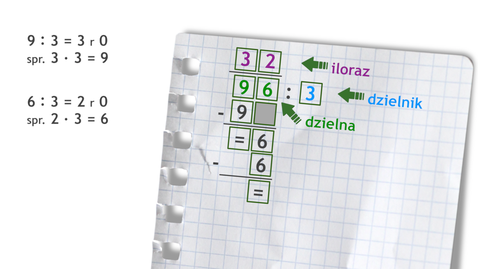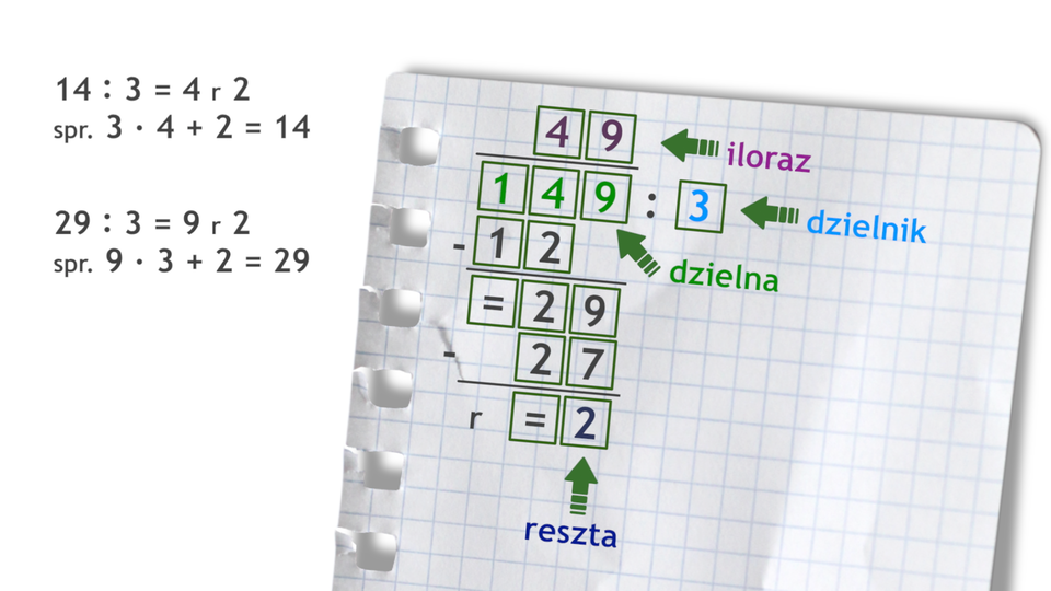 zapis pisemny wierszami wiersz wynikuwiersz działania głównegoliczba całkowita z dzielenia głównego: uzupełnij dwucyfrową liczbąTu uzupełnijreszta z dzielenia