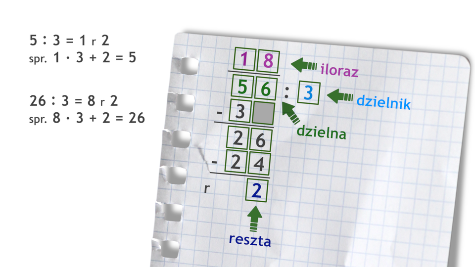 a) 59 : 7 = ............ r ............ ponieważ 8 ∙ ............ + 3 = ............