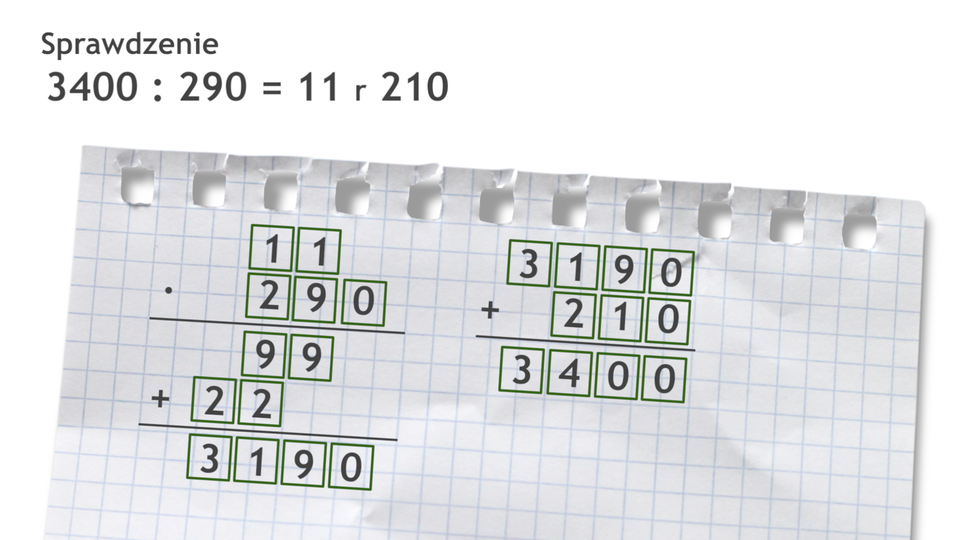 Animacja przedstawia jak podzielić przez siebie dwie liczby sposobem pisemnym, oraz jak sprawdzić czy wynik takiego dzielenia jest poprawny.