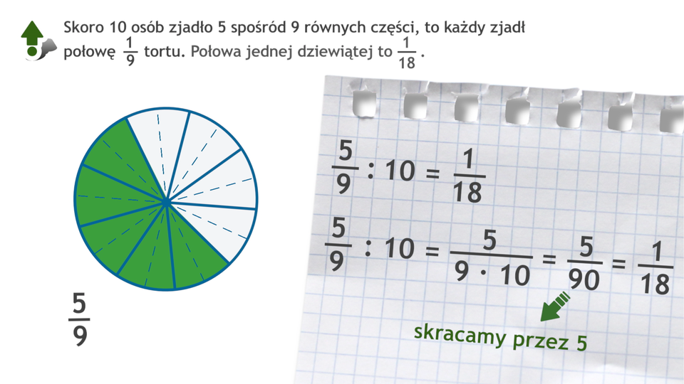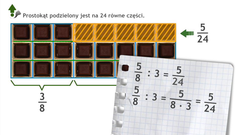 Animacja przedstawia w jaki sposób możemy podzielić ułamek przez liczbę naturalną.