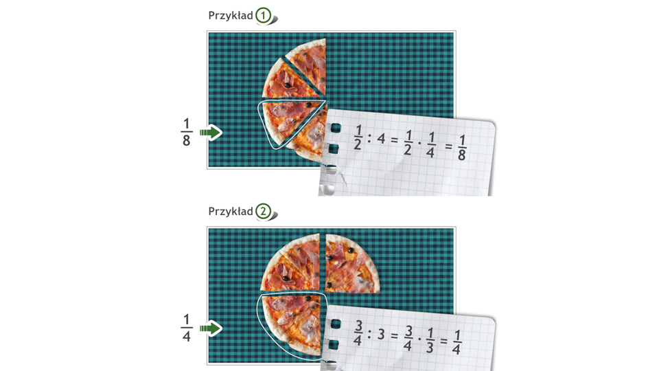 Animacja przedstawia przykłady dzielenia ułamków przez liczby naturalne.