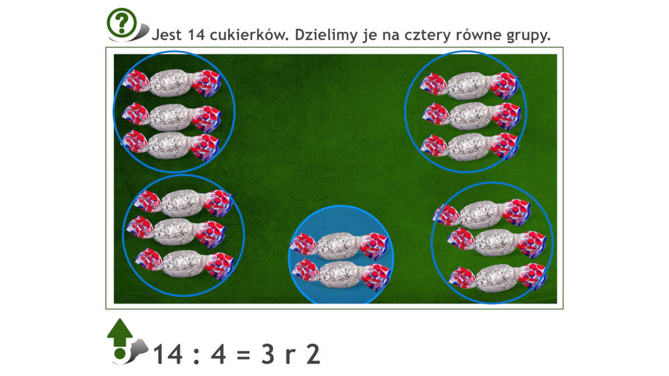 Animacja na przykładzie cukierków pokazuje dzielenie liczby czternaście z resztą.