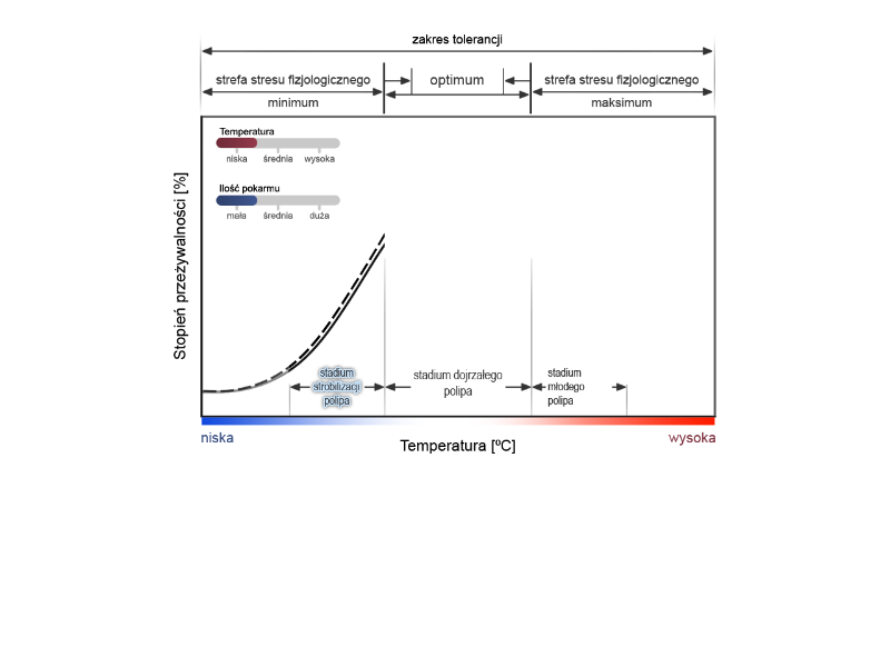 Wykres przedstawia tolerancję ekologiczną polipów chełbii modrej w stosunku do temperatury, wpływ dostępności i jakości pokarmu na ich zdolność do przechodzenia różnych stadiów rozwojowych oraz stopień ich przeżywalności w danych warunkach. Na osi y opisano stopień przeżywalności wyrażony w procentach, natomiast na osi x opisano temperaturę otoczenia, od niskiej, przez średnią, aż do wysokiej. Temperatura niska oznaczona jest jako strefa stresu fizjologicznego, minimum. Temperatura wysoka oznaczona jest jako strefa stresu fizjologicznego, maksimum. Między tymi strefami znajduje się optimum dla danego organizmu, stopień przeżywalności jest w tym miejscu najwyższy. Wykres ma rozkład normalny. W niskiej temperaturze oraz przy małej ilości pokarmu odbywa się stadium strobilizacji polipa. W średniej temperaturze oraz przy średniej ilości pokarmu odbywa się stadium dojrzałego polipa. W wysokiej temperaturze oraz przy dużej ilości pokarmu odbywa się stadium młodego polipa.