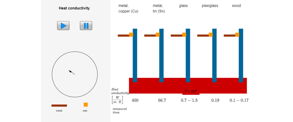 Rysunek symbolicznie przedstawia doświadczenie pokazujące, które z materiałów są lepszymi przewodnikami ciepła: miedź, cyna, szkło, plexiglas, drewno. Na szarym tle po lewej od góry napis Heat conductivity, poniżej przyciski play (trójkąt równoboczny, którego wierzchołek skierowany jest w prawo) i pauza (dwa równoległe pionowe prostokąty), poniżej okrąg ze strzałką w środku skierowaną do góry w lewo, poniżej prostokąt brązowy, symbolizujący materiał, opisany wood i żółty kwadrat, symbolizujący wosk, którym przyczepiony jest materiał do pręta, opisany wax. Po prawej stronie rysunku od góry napisy od lewej: metal, copper (Cu); metal, tin (Sn); glass; plexiglass, wood. Poniżej pięć pionowych prostokątów, symbolizujących pręty, na górze których znajdują się po lewej stronie połączone ze sobą kwadrat żółty i prostokąt brązowy, symbolizujących wosk i dołączony do niego odpowiedni materiał. Wszystkie pięć prostokątów narysowane jest na dole na czerwonym prostokącie, symbolizującym grzejnik o temperaturze T równa się 100 stopni. Poniżej podane wartości przewodnictwa cieplnego dla każdego z materiałów, podpisane Heat conductivity, w nawiasie kwadratowym ułamek, w mianowniku W, w liczniku m pomnożyć przez K, zamknąć nawias. Od lewej: dla miedzi 400, dla cyny 66,7, dla szkła od 0,7 do 1,5, dla plexiglasu 0,19, dla drewna od 0,1 do 0,17.