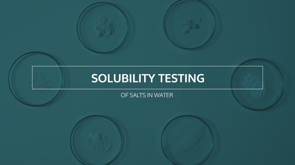 Film pokazuje eksperyment badania rozpuszczalności soli w wodzie, Solubility testing of salts in water. Problem badawczy: Czy wszystkie sole rozpuszczają się w wodzie w jednakowym stopniu? Hipotezy: Wszystkie sole rozpuszczają w wodzie. Są sole, które dobrze rozpuszczają się w wodzie, i takie, które są trudno rozpuszczalne. Sole są nierozpuszczalne w wodzie. Będziesz potrzebować: zlewki, bagietki szklane, łyżeczki, woda, chlorek wapnia, chlorek sodu, siarczan(VI) magnezu, węglan magnezu, węglan wapnia, fosforan(V) wapnia, węglan sodu. Instrukcja: Do siedmiu jednakowych zlewek wlej identyczną objętość wody (pięćdziesiąt centymetrów sześciennych). Do każdej z nich wsyp od trzech do pięciu gramów substancji: do zlewki pierwszej – chlorku wapnia, do zlewki drugiej – chlorku sodu, do zlewki trzeciej – siarczanu(VI) magnezu, do zlewki czwartej – węglanu magnezu, do zlewki piątej – węglanu wapnia, do zlewki szóstej – fosforanu(V) wapnia, do zlewki siódmej – węglanu sodu. Zawartość wszystkich zlewek dokładnie wymieszaj za pomocą bagietki.