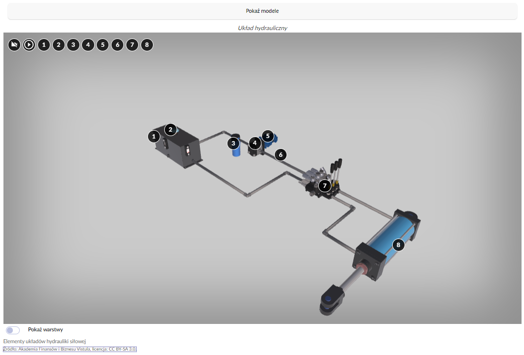 Opis modelu: Układ hydrauliczny składa się ze zbiornika oleju hydraulicznego, który ma kształt prostopadłościanu. Na górnej ścianie zbiornika zamontowany jest filtr odpowietrzający. Na przedniej ścianie zbiornika znajduje się manometr. Kolejnym elementem jest filtr w kształcie cylindra, zatrzymujący zanieczyszczenia, które mogłyby się przedostać ze zbiornika do pompy hydraulicznej. Pompa hydrauliczna jest złożona z dwóch elementów, jeden jest w kształcie cylindra, który kryje silnik pompy, drugi w kształcie prostopadłościanu. Rozdzielacz to rodzaj zaworu, z podłączonymi czterema przewodami, który steruje przepływem oleju. Ostatnią częścią jest siłownik hydrauliczny dwustronnego działania, który ma kształt cylindra z wysuwającym się i wsuwającym tłokiem. Na modelu znajdują się ponumerowane znaczniki.