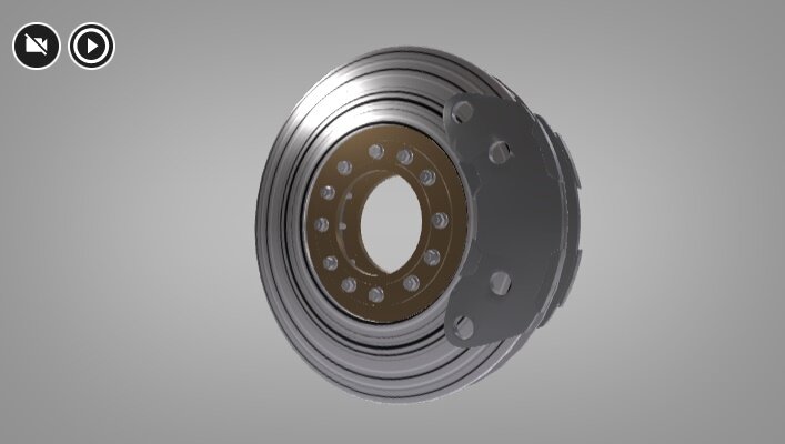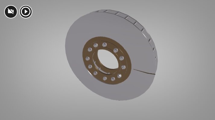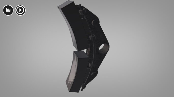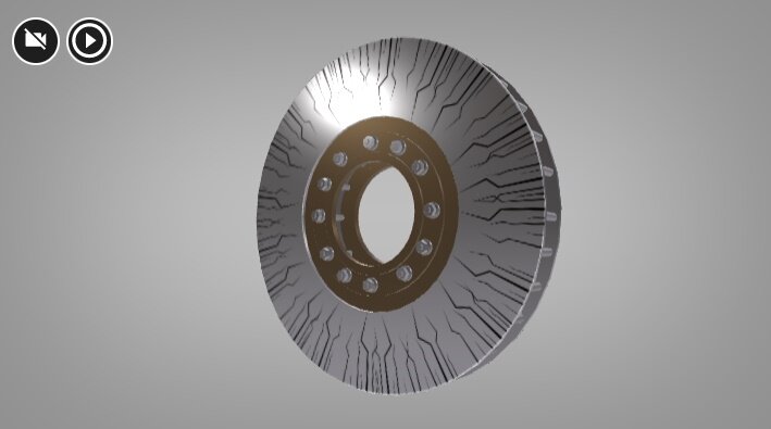 Wizualizacja przedstawia hamulec tarczowy posiadający dwie powierzchnie cierne. Klocek hamulcowy w takim typie hamulców przylega do płaskiej części koła. Powierzchnie cierne są widoczne zarysowane.