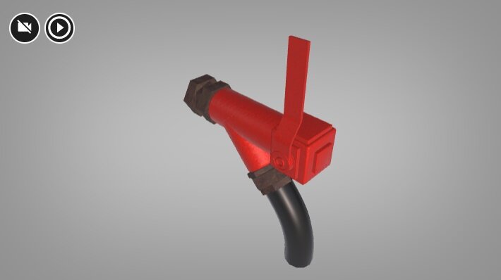 Wizualizacja przedstawia kurek końcowy. Kurek ten jest przymocowany do przewodu. Jego rękojeść jest uniesiona do góry.