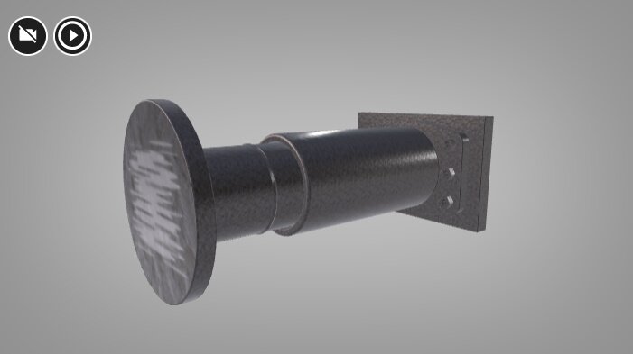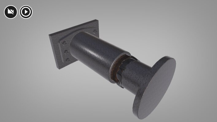 Wizualizacja przedstawia urządzenie zderzakowe. Tuleja zderzaka zakończona jest tarczą zderzaka, na której widoczne są rysy.