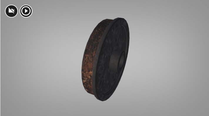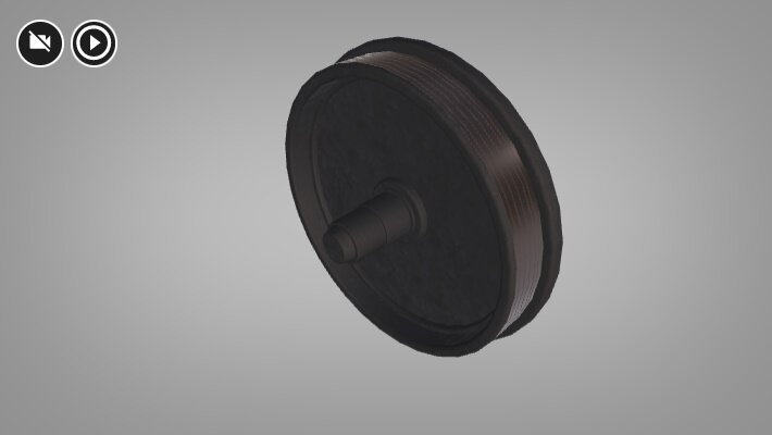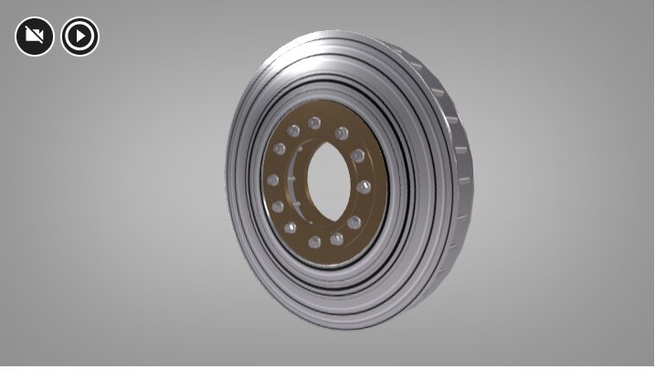 Wizualizacja przedstawia koło z hamulcem klockowym. Jest to klocek typu Bgb, posiada on dwie okładziny. Okładzina hamulcowa w tego typu hamulcach dokładnie przylega do krawędzi koła. Ze środka koła wystaje sworzeń do mocowania koła do układu kierowania.