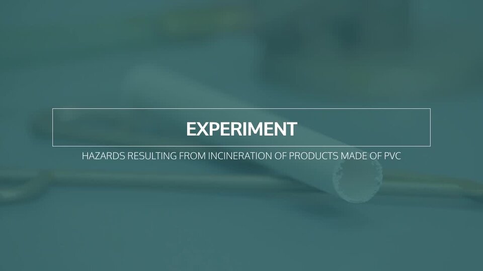 Nagranie filmowe przedstawiające eksperyment: "zagrożenie wynikające ze spalania produktów wykonanych z PVC" (hazard resulting from incineration of products made of PVC). Do eksperymentu potrzebne są: palnik Bunsena (Bunsen burner) plastikowa rurka (plastic tube) szczypce (tongs) czysta butelka (wash bottle) polichlorek winylu (poli vinyl chloride) papierek lakmusowy (litmus paper). Na filmie widać jak naukowiec szczypcami (tongs) trzyma nad palnikiem (Bunsen burner) kawałek plastikowej rurki (plastic tube). Pod wpływem wysokiej temperatury zmienia ona swój kształ i kolor na czarny. Ze spalonego kawałka plastikowej rurki unosi się dym (acidic gas). Naukowiec przykłada w to miejsce papierek lakmusowy (litmus paper). Zabarwia się on na kolor pomarańczowy.