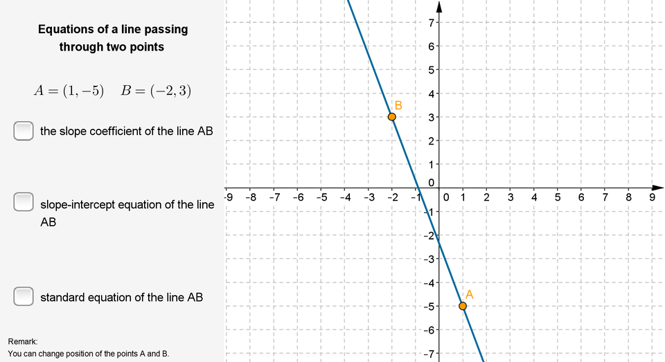 Open Geogebra applet „Equations of a line passing through two set points”. Change the position of points and . Find the slopeslopeslope of line and the equation of this line in the slope‑intercept and the standard formstandard form standard form.