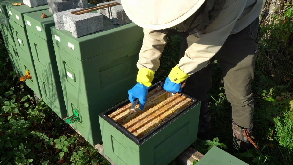 Na zdjęciu widoczny jest pszczelarz ubrany w specjalny kombinezon ochronny z rękawiczkami, który wyciąga tacki z uda. Tacki pokryte są pszczołami.