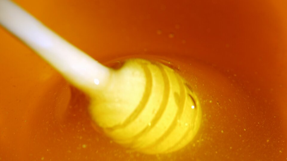 Zdjęcie przestawia pojemnik o kształcie walca, do którego przekładany jest miód.