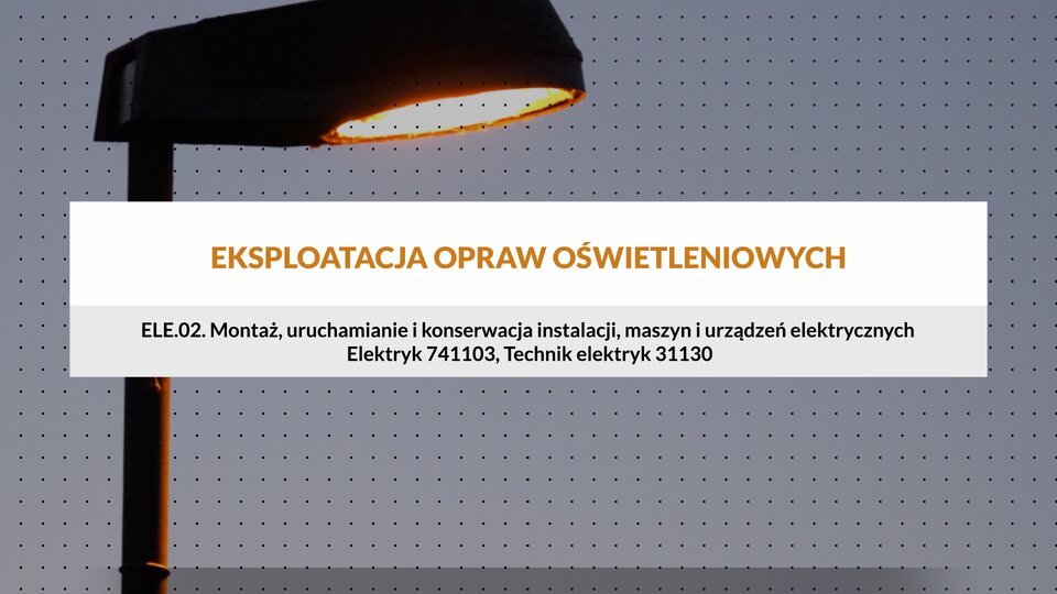 Film pt. „Eksploatacja opraw oświetleniowych dla klasyfikacji ELE.02. Montaż, uruchamianie i konserwacja instalacji, maszyn i urządzeń elektrycznych, zawód Elektryk 741103, Technik elektryk 31130.