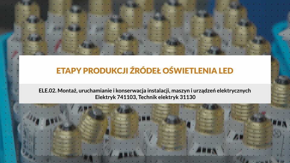 Film edukacyjny pt. „Etapy produkcji źródeł oświetlenia LED” dla klasyfikacji ELE .02 Montaż, uruchamianie i konserwacja instalacji, maszyn i urządzeń elektrycznych, zawód Elektryk 741103, Technik elektryk 31130.