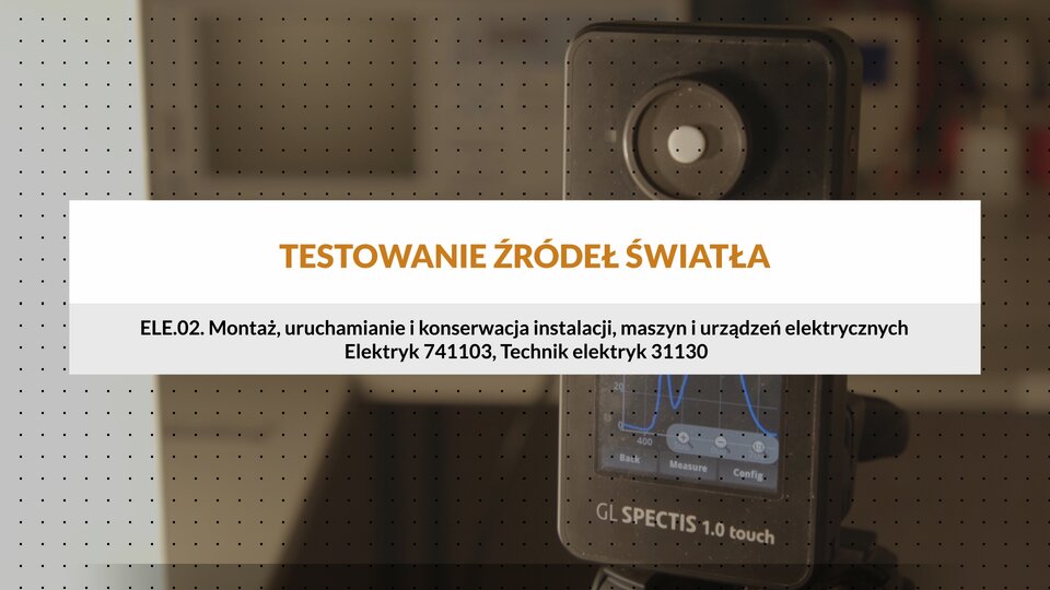 Film pt. „Testowanie źródeł światła" dla klasyfikacji ELE.02. Montaż, uruchamianie i konserwacja instalacji, maszyn i urządzeń elektrycznych, zawód Elektryk 741103, Technik elektryk 31130.