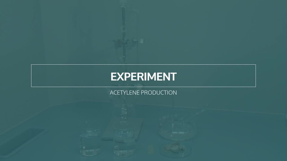 Nagranie filmowe dotyczące sposobu otrzymywania etynu z karbidu, acetylene production w środowisku mieszaniny wody i alkoholu. W wyniku reakcji wydziela się gaz, etyn. Do przeprowadzenia eksperymentu potrzebne będą beakers, plug, crystalizer, test tube, drain tube, flask with dropping funnel, retort stand. Chemik w kolbie okrągłodennej umieszcza karbid, następnie ostrożnie wlewa roztwór wody i alkoholu do wkraplacza. Następnie za pomocą kranika stopniowo wprowadza roztwór do kolby. Karbid w warunkach normalnych reaguje egzotermicznie z wodą. Wydziela się gaz, acetylen, który zbierany jest za pomocą wężyka do probówki zanużonej w wodzie i odwróconej do góry dnem. Jedna cząsteczka węgliku wapnia (karbidu) reagując z dwiema cząsteczkami wody daje jedną cząsteczkę acetylenu (etynu) oraz jedną cząsteczkę wodorotlenku wapnia.