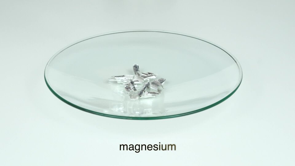 Nagranie filmowe przedstawia doświadczenie - spalanie magnezu w powietrzu. Użytkownik pobiera próbkę magnezu i podstawia ją pod płomień palnika kuchenki gazowej. Magnez zaczyna płonąć jasnym mocnym płomieniem.