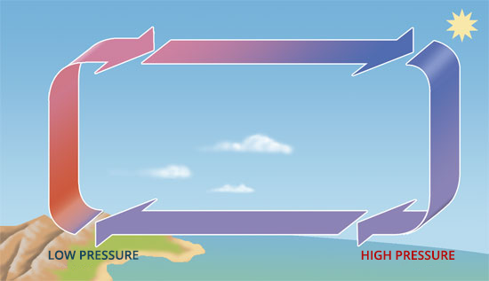 Another local wind is breezebreeze, occurring at the sea. Breezes are formed as a result of the difference of air pressure between land area and water area. Humid air over water changes its temperature more slowly than dry air over land. Therefore, during daylight hours it is warmer over land, and warmed up air rises up, leaving lower pressure below which attracts air from above water. This is a sea breeze (onshore breeze). At night, conditions reverse – it is warmer over water because air above this area cools down more slowly; lower air pressure is formed, attracting air from above land. This is a land breeze (offshore breeze).