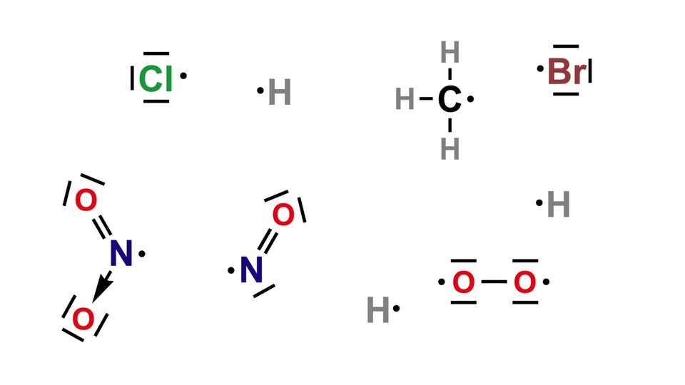 Poniżej przedstawiono reakcje, jakie mogą przebiegać podczas tworzenia się smogu fotochemicznego. Wskaż, które z drobin biorących udział w tych reakcjach, są rodnikami.