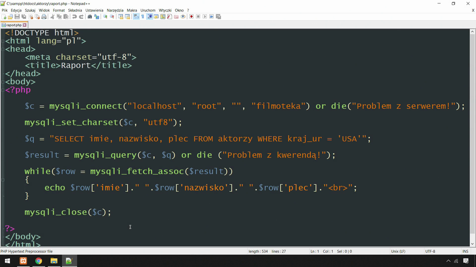 Zrealizujmy w praktyce czytelne formatowanie generowanego w skryptach kodu źródłowego HTML. Z filmu samouczka dowiemy się, jak zamykać surowe wartości wyjęte z bazy danych, wewnątrz odpowiednich znaczników HTML oraz jak stosować tzw. znaki sterujące (formatujące wyjście) w PHP: