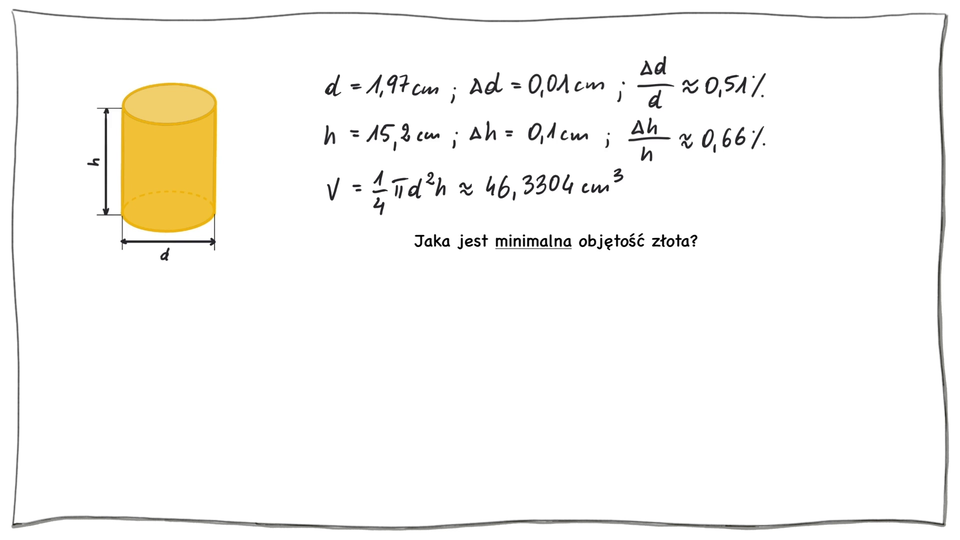 Zapoznaj się z filmem samouczkiem, w którym - na przykładzie pomiaru objętości stalowego pręta - prezentujemy, w jaki sposób można oszacować granice prawdziwości uzyskanych pomiarów pośrednich. Po wysłuchaniu filmu wykonaj umieszczone poniżej polecenia, które pomogą Ci uporządkować zdobyte wiadomości.