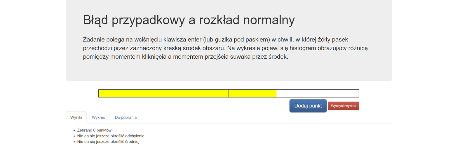 W opisywanej symulacji widoczny jest poziomy, prostokątny pasek o czarnych krawędziach, który w połowie długości przedzielony jest pionowym, czarnym odcinkiem. Początkowo, tło prostokątnego paska jest białe. Cyklicznie, wnętrze paska pokrywa się żółtym kolorem od lewej strony do prawej. Zadaniem użytkownika jest zatrzymanie żółtego wypełnienia w chwili, gdy zmieniony zostanie kolor dokładnie połowy pola powierzchni. Służy do tego niebieski przycisk „Dodaj punkt poniżej symulacji”. Dodany punkt ma wymiar czasu wyrażonego w sekundach. Wykonanie wielu powtórzeń powoduje zapisanie wszystkich wyników i wyświetlenie informacji poniżej symulacji ilości wykonanych prób, odchyleniu standardowym wyników wyrażonym w milisekundach i średniej różnicy czasu wyrażonego również w milisekundach. Informacje te znajdują się w zakładce podpisanej jako wyniki. Obok tej zakładki widoczna jest kolejna opisana, jako wykres. Po jej otworzeniu, na ekranie pojawia się układ współrzędnych narysowany czarnymi liniami. Oś pionowa układu, skierowana jest w górę i opisuje „Zaokrągloną ilość powtórzeń wyniku”. Oś pozioma, skierowana jest w prawo i przedstawia zapisane w trakcie powtórzeń wyniki, zaokrąglone do dwudziestu milisekund. W układzie widoczny jest histogram w postaci niebieskich słupków, ilustrujących ilość powtórzeń każdego z wyników. Do niebieskich słupków dopasowana jest niebieska, ciągła krzywa Gaussa prezentująca rozkład uzyskanych wyników. W trzeciej zakładce znajdują się pliki z zapisanymi w formie elektronicznej danymi, wykorzystanymi do sporządzenia histogramu oraz obliczeń. Doświadczenie można powtórzyć dla nowych danych po kliknięciu lewym przyciskiem myszy na czerwony przycisk podpisany jako „Wyczyść wykres”. Przycisk widoczny jest poniżej symulacji, z prawej strony przycisku „Dodaj wynik”.