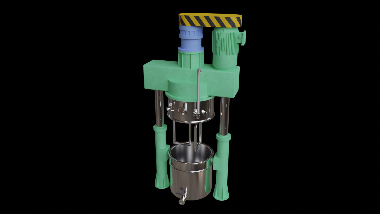 Model 3D przedstawia mieszalnik planetarny. Na podstawie składającej się z poziomej belki oraz dwóch, pionowych nóg zamontowano mieszadło z dwoma łopatkami. Zanurza się ono w zbiorniku, znajdującym się w dolnej części mieszalnika, kadzi. W górnej części widoczne dwie rury. Nagrania tożsame z treścią.
