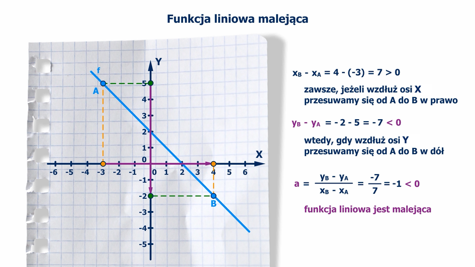 Animacja pokazuje, jak mając współrzędne punktów A i B należących do prostej, obliczyć współczynnik kierunkowy funkcji liniowej malejącej f(x) =ax +b. Punkt A = (-3, 5), B =(4, -2). Obliczamy różnicę argumentów i różnicę wartości funkcji dla tych argumentów. Zauważamy, że różnica argumentów jest większa od zera, zawsze, jeżeli przesuwamy się od A do B wzdłuż osi x w prawo. Różnica wartości funkcji jest mniejsza od zera, zawsze, jeżeli przesuwamy się wzdłuż osi y od punktu A do B w dół. Wobec tego, zgodnie ze wzorem, iloraz różnicy dwóch wartości funkcji liniowej przez różnicę odpowiadających im argumentów jest mniejszy od zera. Funkcja liniowa jest malejąca.