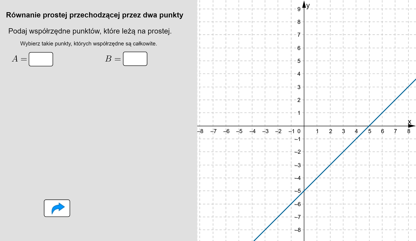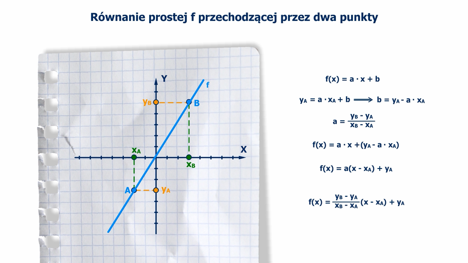 Animacja pokazuje jak wyznaczyć równanie prostej przechodzącej przez dwa punkty A i B.