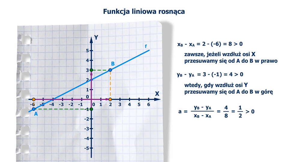 Animacja pokazuje, jak mając współrzędne punktów A i B należących do prostej, obliczyć współczynnik kierunkowy funkcji liniowej rosnącej f(x) =ax +b. Punkt A = (-6, -1), B =(2, 3). Obliczamy różnicę argumentów i różnicę wartości funkcji dla tych argumentów. Zauważamy, że różnica argumentów jest większa od zera, zawsze, jeżeli przesuwamy się od A do B wzdłuż osi x w prawo. Różnica wartości funkcji jest większa od zera, zawsze, jeżeli przesuwamy się wzdłuż osi y od punktu A do B w górę. Wobec tego, zgodnie ze wzorem, iloraz różnicy dwóch wartości funkcji liniowej przez różnicę odpowiadających im argumentów jest większy od zera. Funkcja liniowa jest rosnąca.