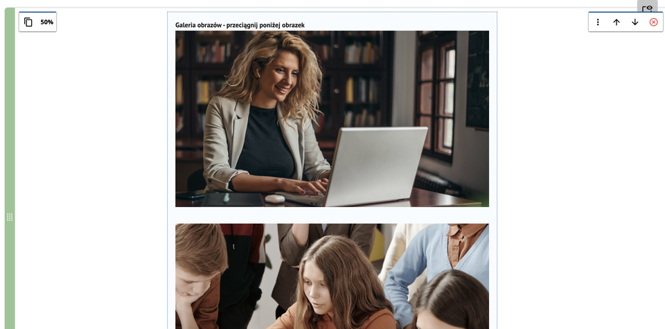 Po kliknięciu ikony Galeria - siatka system wstawia pole, na które należy przeciągnąć ilustracje znajdujące się w obszarze roboczym