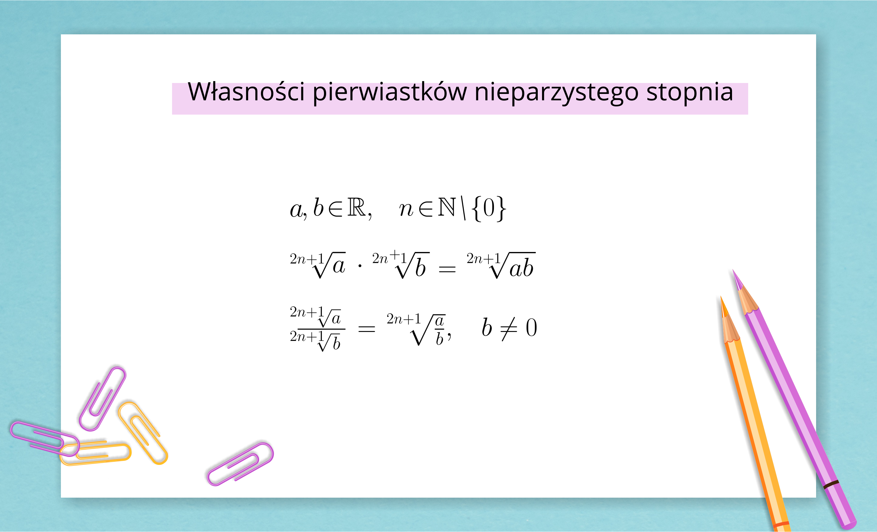 1. {audio}Jeżeli stopień pierwiastka jest liczbą nieparzystą, to jest sens mówić o pierwiastkach z liczb ujemnych. W takim przypadku pod pierwiastkiem może znaleźć się dowolna liczba rzeczywista.