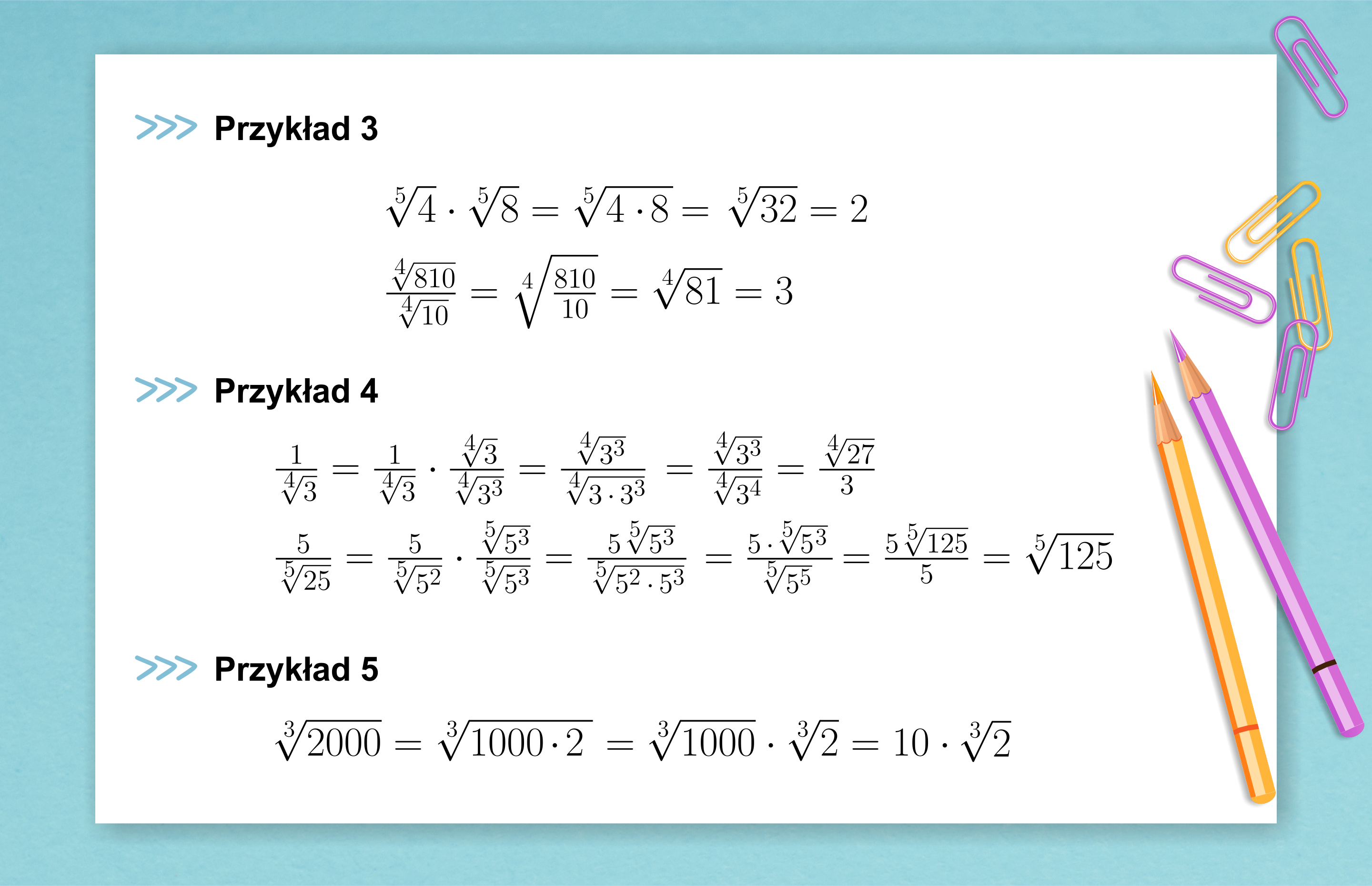 1. {audio}Pierwiastkowanie jest rozdzielne względem mnożenia i dzielenia. Innymi słowy iloczyn pierwiastków tego samego stopnia jest równy pierwiastkowi iloczynu oraz iloraz pierwiastków tego samego stopnia jest równy pierwiastkowi z ilorazu.