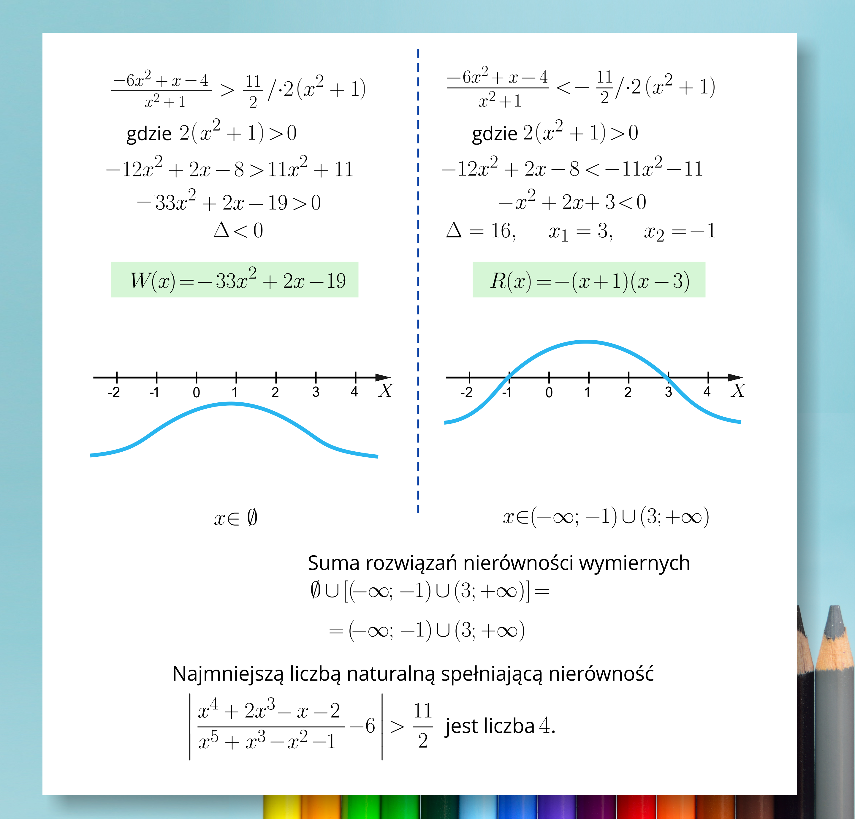 W danym przypadku nie mnożymy przez kwadrat mianownika, ponieważ dla : . Gdzie . Zwrot nierówności nie ulega zmianie, ponieważ mnożymy nierówność obustronnie przez . Doprowadzamy nierówność do najprostszej postaci. , . Wyróżnik trójmianu kwadratowego jest dodatni. . . Sporządzamy wykres funkcji wielomianowej . Ilustracja przedstawia poziomą oś X od minus dwóch do czterech oraz wykres funkcji, parabolę z ramionami skierowanymi w dół. Wykres przyjmuje wartości dodanie w przedziale oraz wartości ujemne w przedziale . . Najmniejszą liczbą naturalną spełniającą nierówność jest liczba cztery.