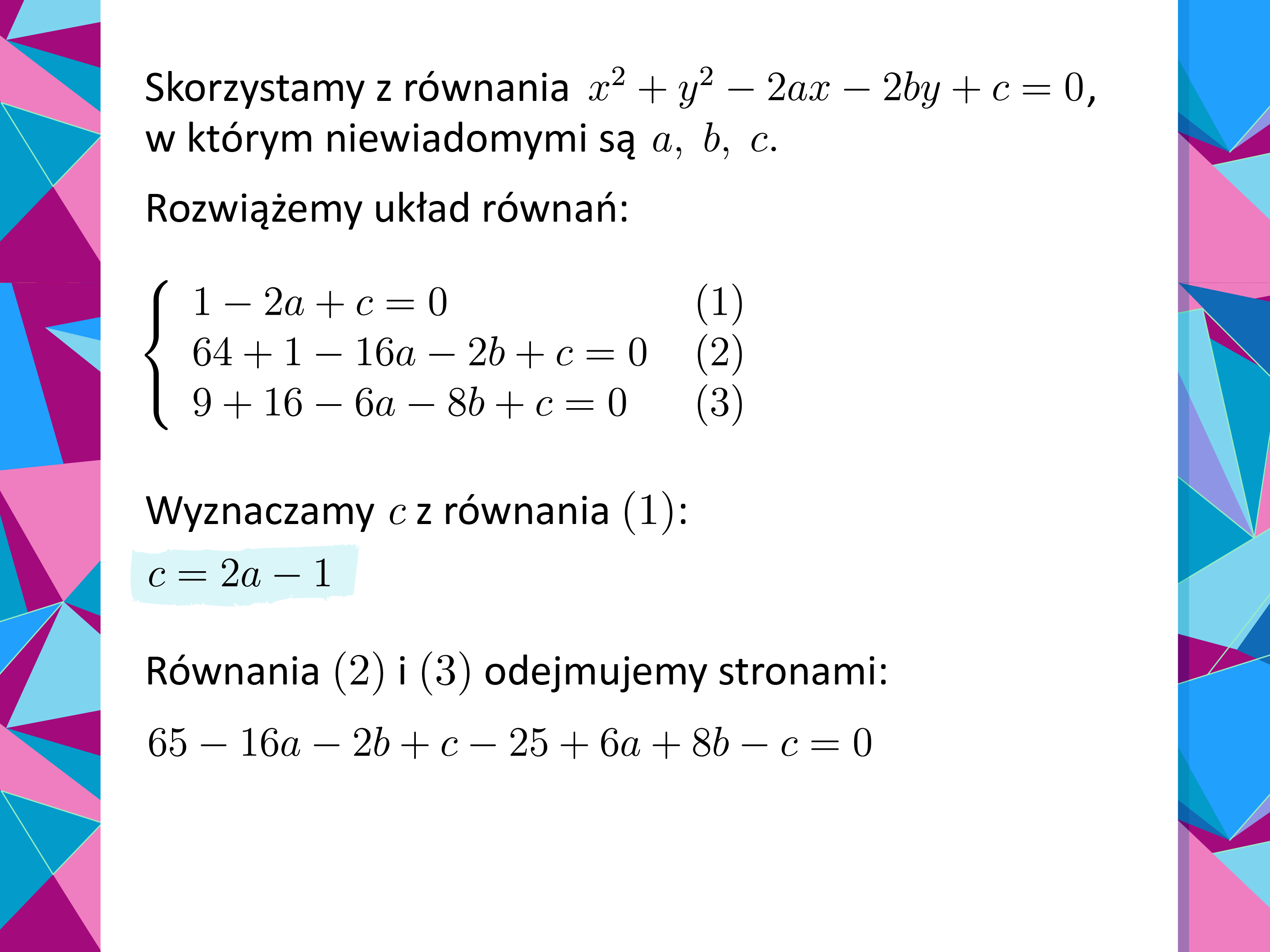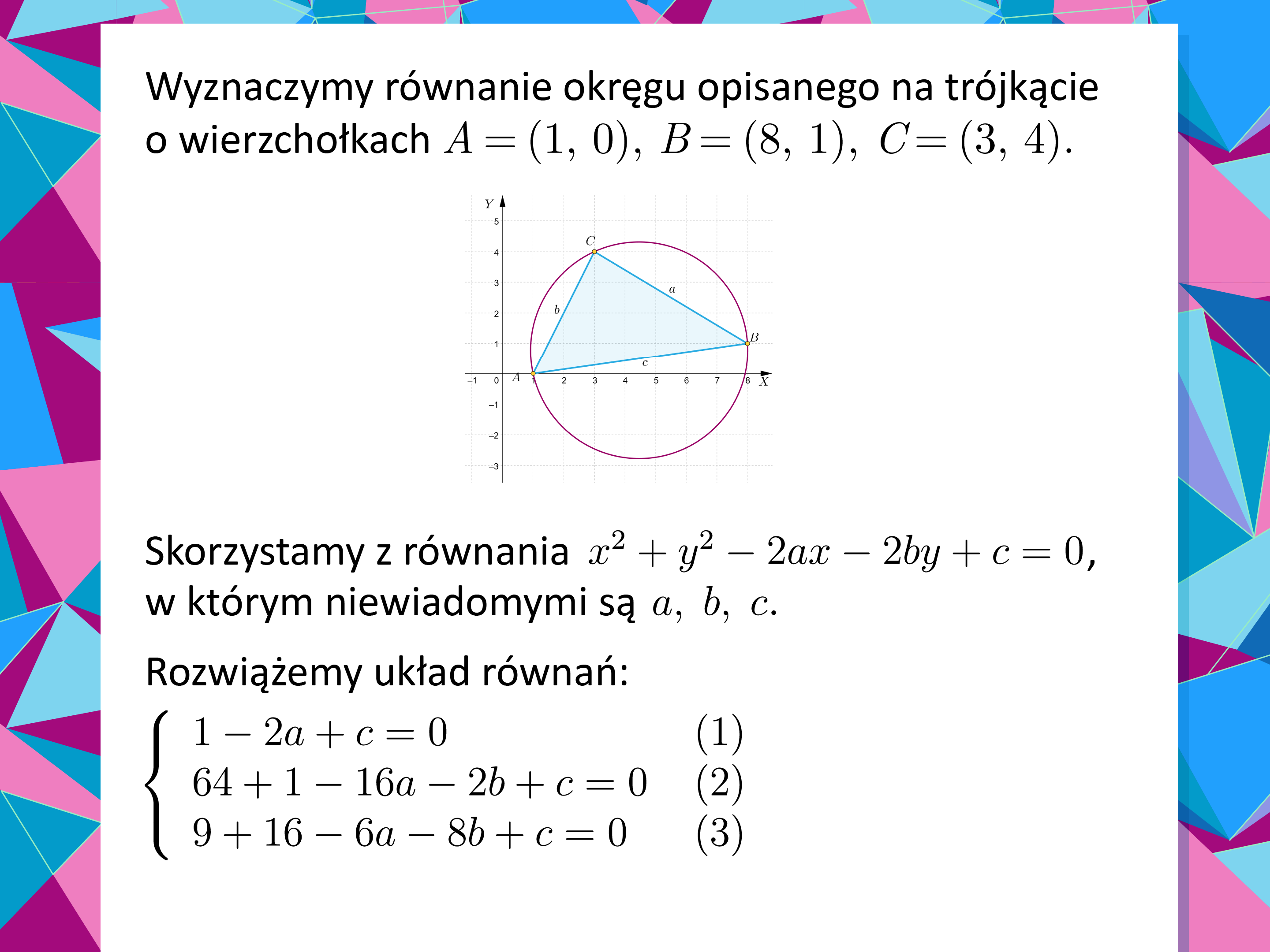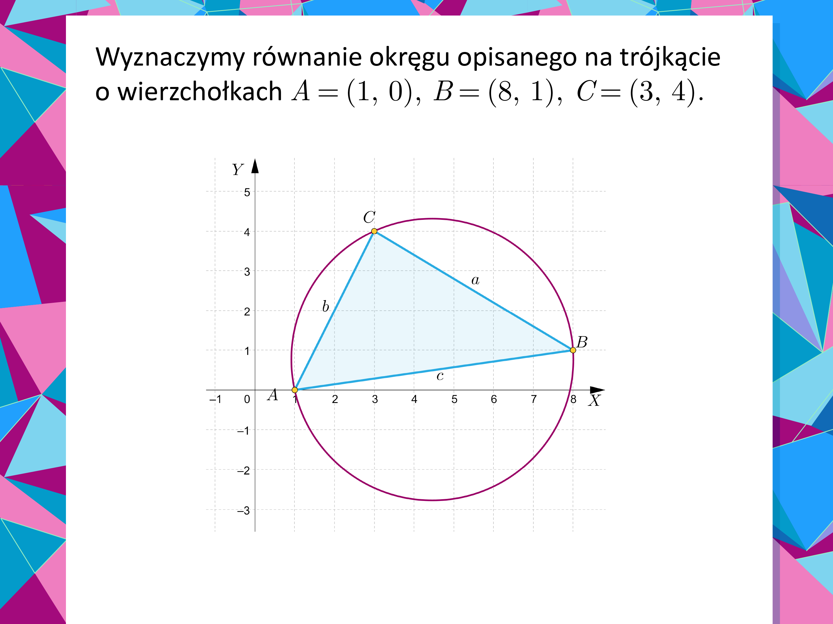 1. {audio}Wyznaczamy wartość i oraz równanie okręgu opisanego na trójkącie .