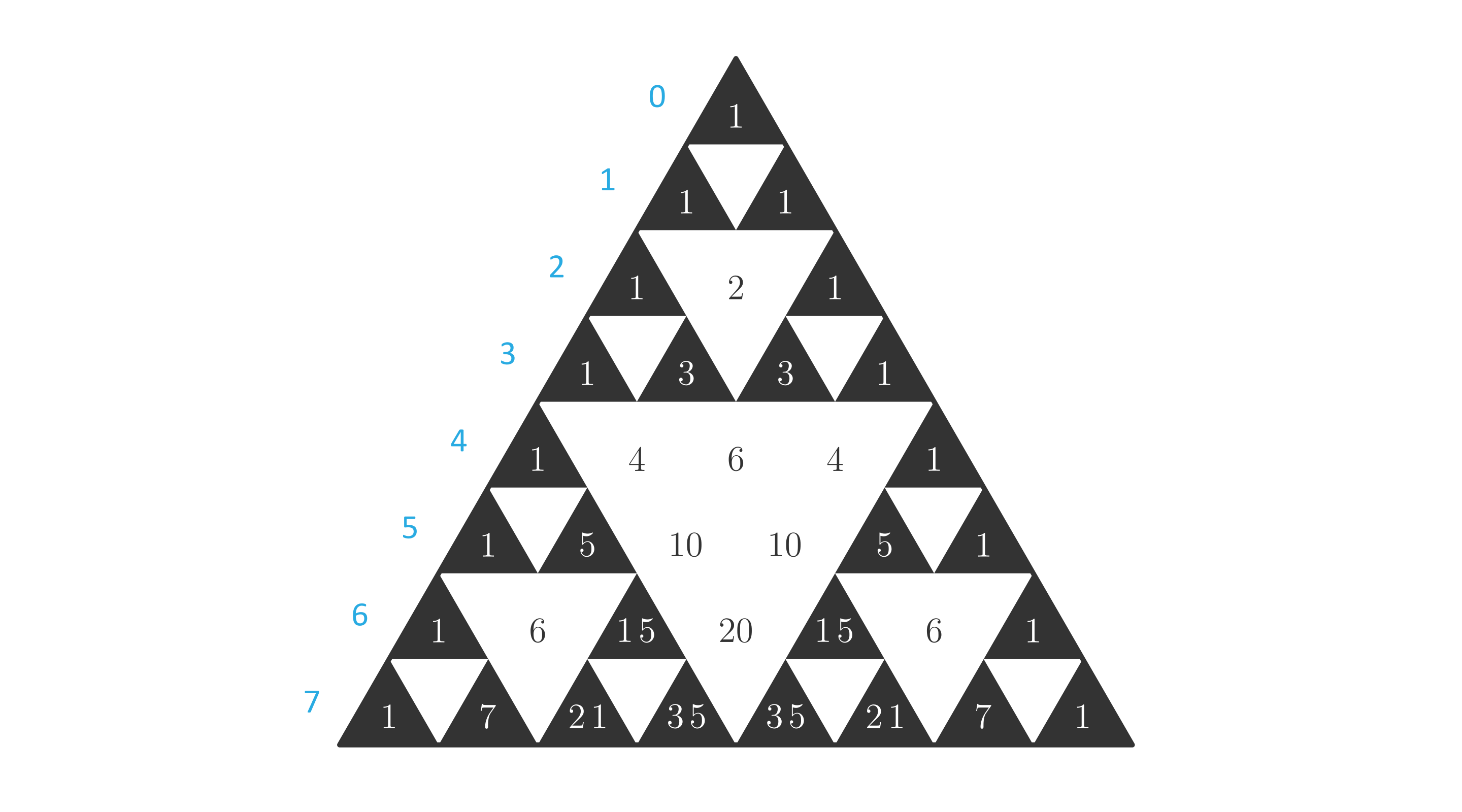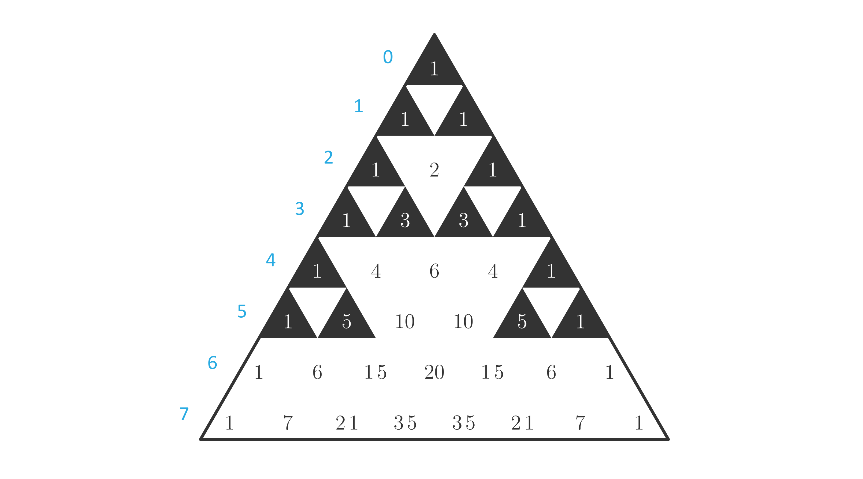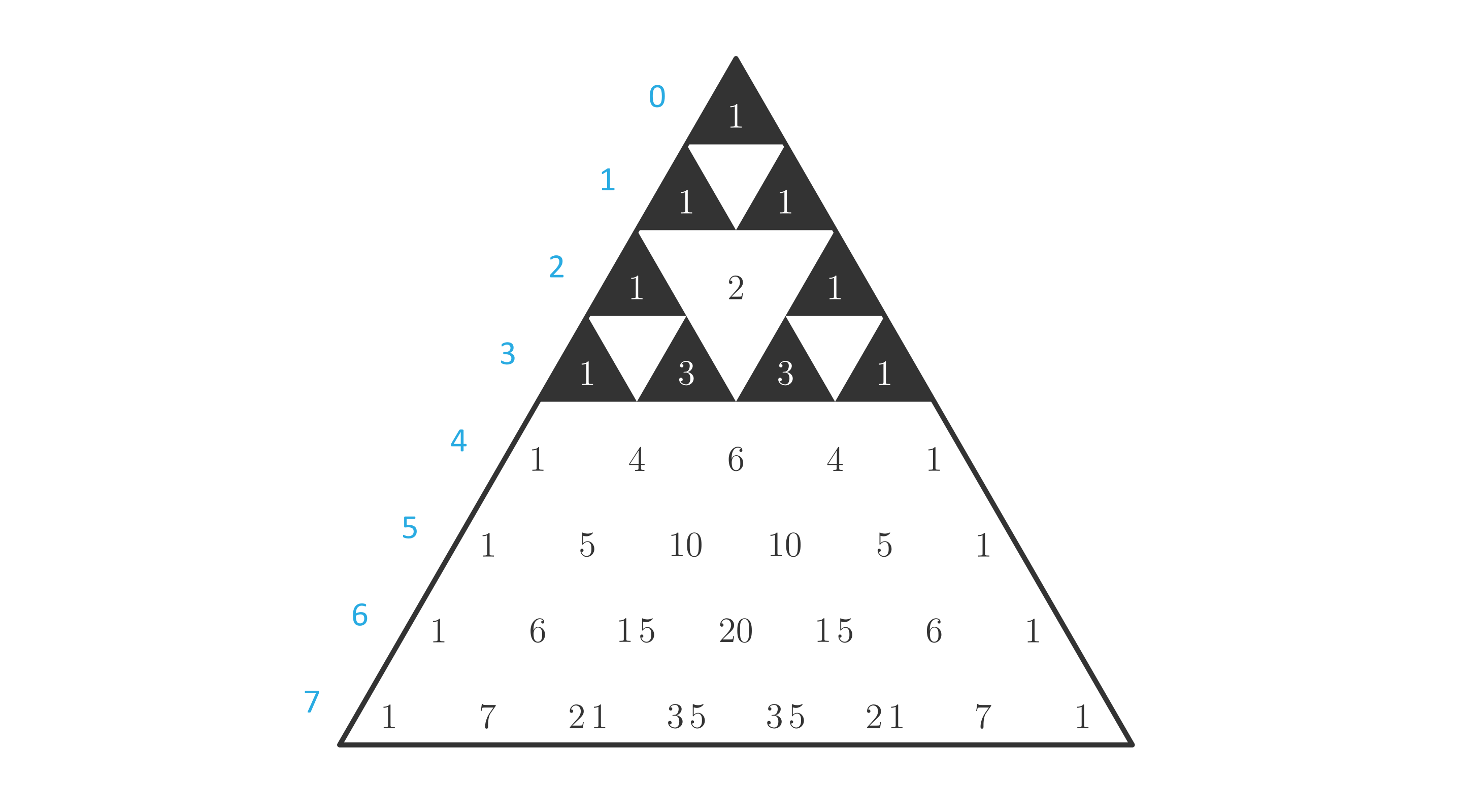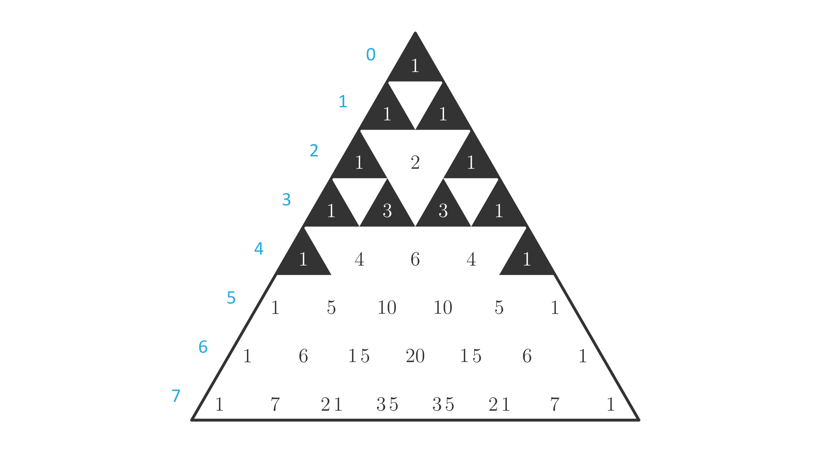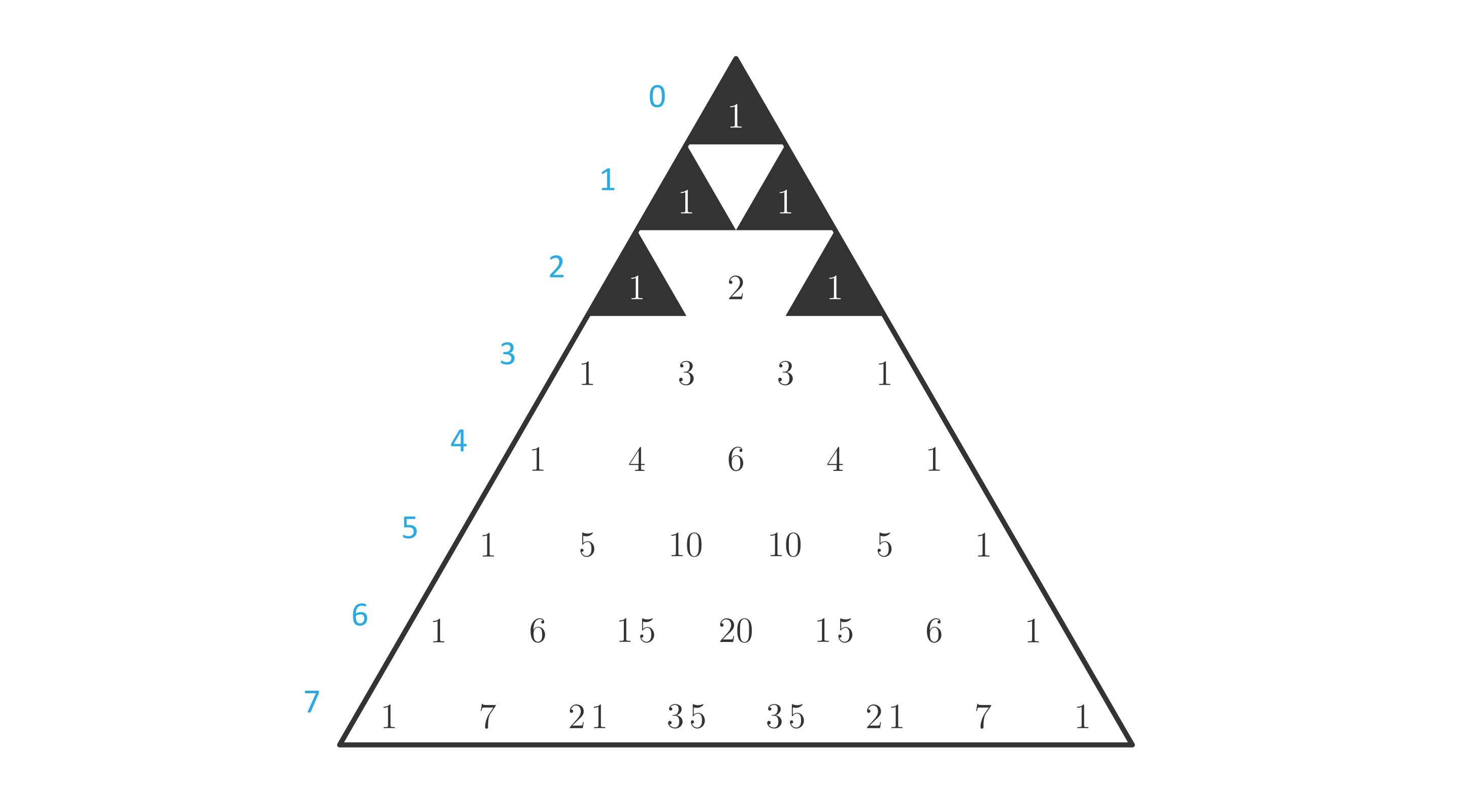 Narysuj trójkąt Pascala dla i zamaluj pola z tymi liczbami, które przy dzieleniu przez dają resztę . Co zauważasz?