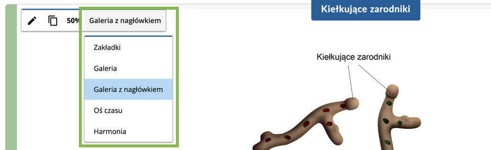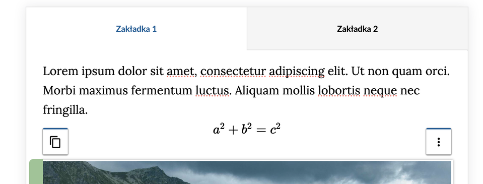 Komponent do prezentowania procesów, zestawień, czy tworzenia galerii. Kliknięcie ikony Galerie i zakładki powoduje wstawienie dwóch przykładowych zakładek, z czego pierwsza ma dodatkowo miejsce na osadzenie ilustracji. O ile nie przeciągniemy do niego własnego zdjęcia, system zachowa jedynie tekst.
