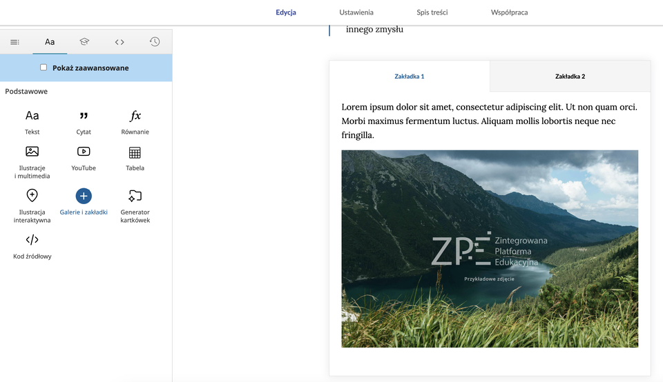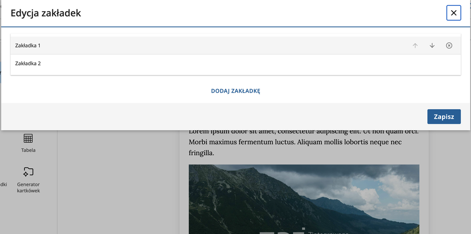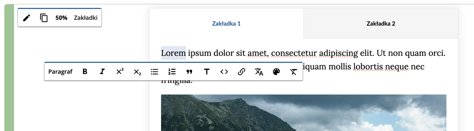 Komponent do prezentowania procesów, zestawień, czy tworzenia galerii. Kliknięcie ikony Galerie i zakładki powoduje wstawienie dwóch przykładowych zakładek, z czego pierwsza ma dodatkowo miejsce na osadzenie ilustracji. O ile nie przeciągniemy do niego własnego zdjęcia, system zachowa jedynie tekst.