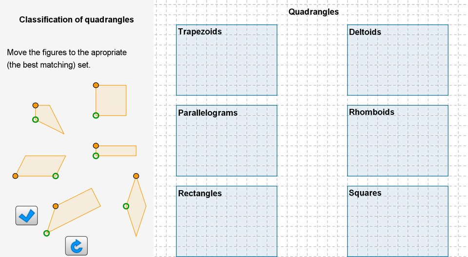 Na rysunku znajduje się napis Quadrangles. Pod napisem znajduje się sześć wyróżnionych pól opatrzonych napisami: Trapezoids, Deltoids, Parallelograms, Rhomboids, Rectangles, Squares. W polu oznaczonym Squares znajduje się kwadrat, W polu oznaczonym Rhomboids znajduje się romb.