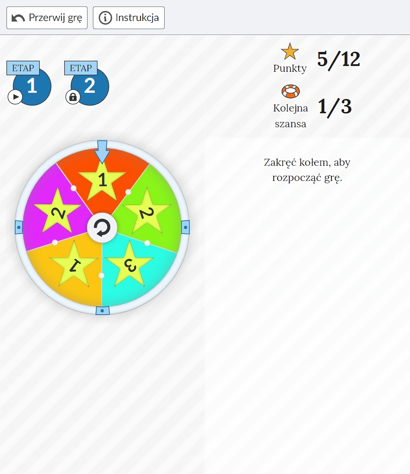 Interaktywna gra - koło fortuny, sprawdza znajomość pisowni wylosowanych wyrazów z „ó”.