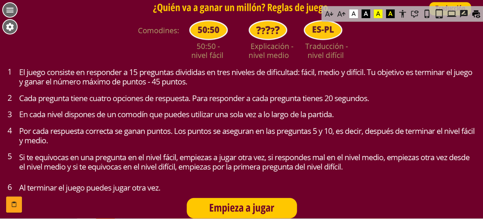 Vamos a jugar al juego “Quién quiere ser millonario?” Debes responder a quince preguntas y conseguir el mayor número posible de respuestas correctas.