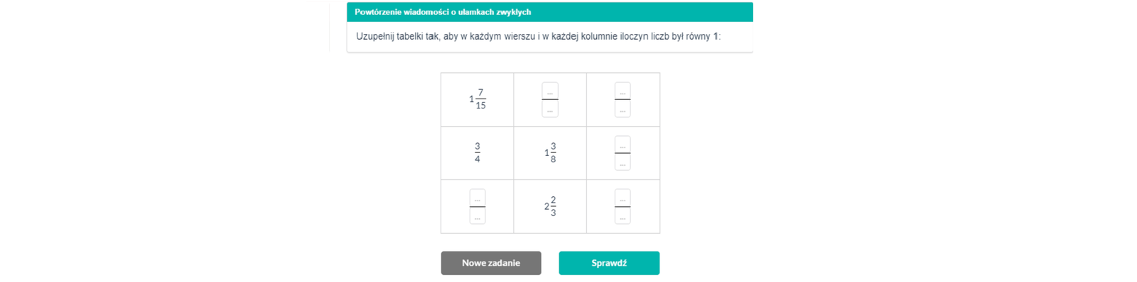 Aby powtórzyć wiadomości o ułamkach, zagraj w grę „ułamkowe sudoku”. Uzupełnij puste miejsca tak, by w zależności od wylosowanego polecenia sumy lub iloczyny kolumn i wierszy dawały określone wyniki.