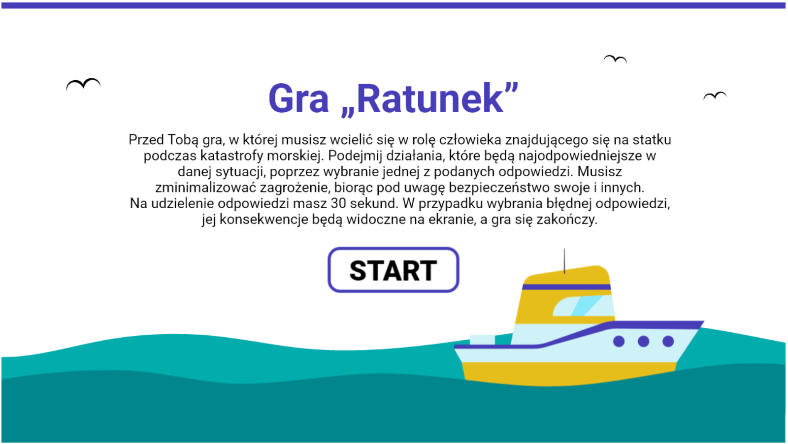 Grafika przedstawia ekran startowy gry wcielanie się w role. Znajduje się na niej następujący tekst: Gra Ratunek. Przed Tobą gra, w której musisz wcielić się w rolę człowieka znajdującego się na statku podczas katastrofy morskiej. Podejmij działania, które będą najodpowiedniejsze w danej sytuacji, poprzez wybranie jednej z podanych odpowiedzi. Musisz zminimalizować zagrożenie, biorąc pod uwagę bezpieczeństwo swoje i innych. Na udzielenie odpowiedzi masz trzydzieści sekund. W przypadku wybrania błędnej odpowiedzi, jej konsekwencje będą widoczne na ekranie, a gra się zakończy. Poniżej widać przycisk start, uruchamiający grę. W tle widać pofalowane morze.