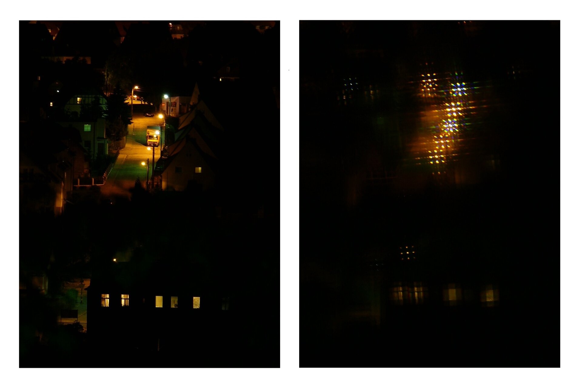 Zdjęcie po lewej przedstawia wieczorny widok z okna na przeciwległą ulicę, a drugie zdjęcie ten sam widok po przesłonięciu obiektywu aparatu. Zgadnij, czym przesłonięto obiektyw?