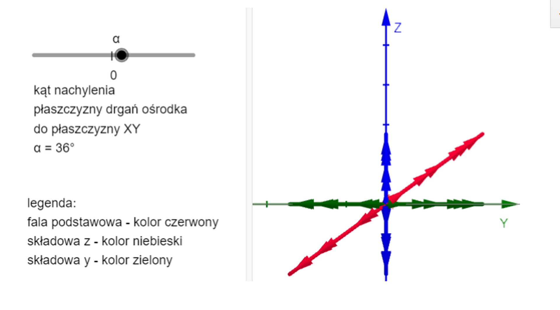 Zastanów się, co zobaczysz po obrocie płaszczyzny fali o kąt i takim ustawieniu układu współrzędnych, aby oś OX była prostopadła do płaszczyzny ekranu. Naszkicuj odpowiedni rysunek i porównaj go z obrazem otrzymanym za pomocą aplikacji.
