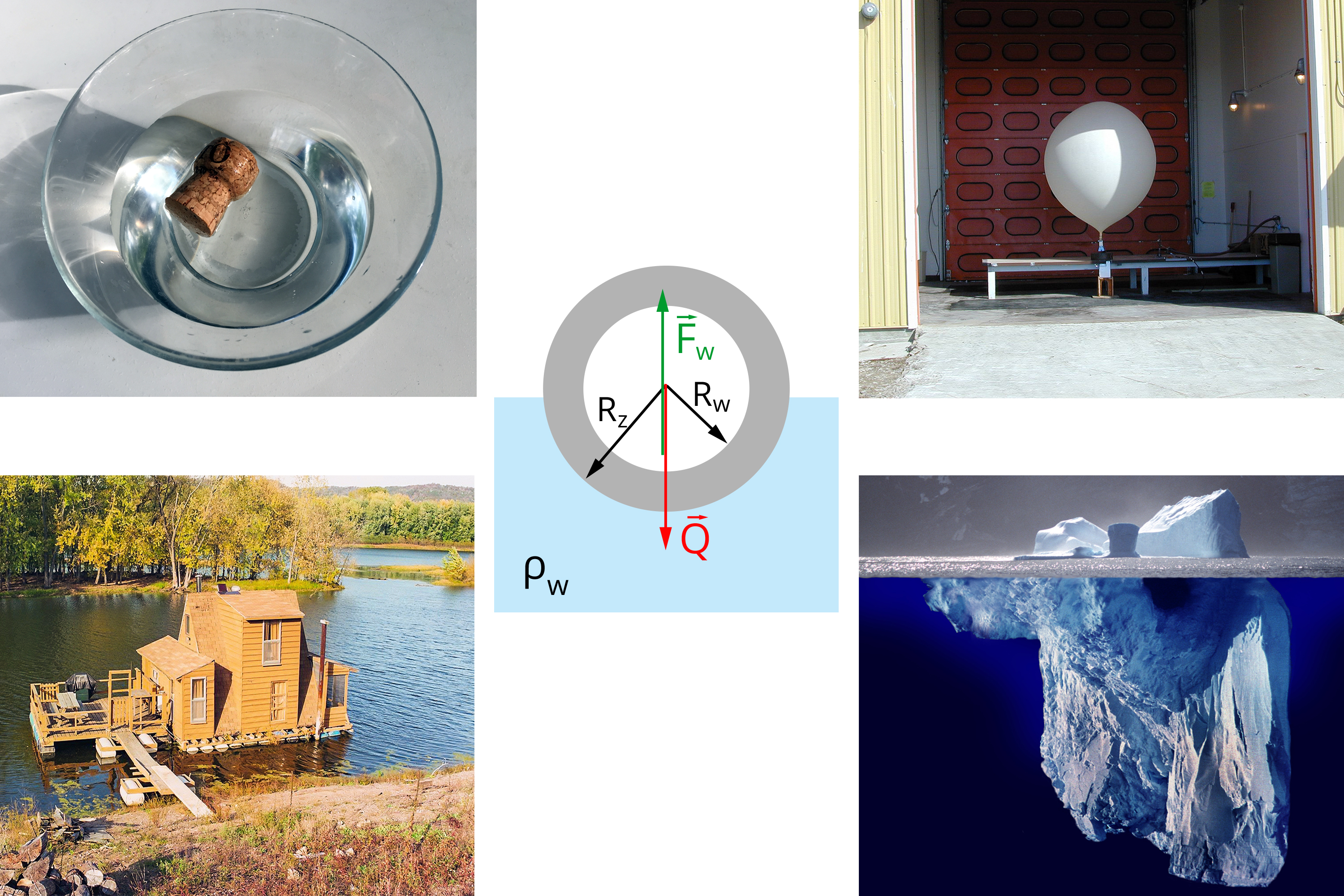 Prawo Archimedesa ma wiele zastosowań w życiu codziennym i w przyrodzie. Grafika zawiera 5 przykładów. Obejrzyj grafikę i zastanów się, jak należałoby uzupełnić brakujące informacje dotyczące zachowania balonu i barki w opisanych przykładach. Zapamiętaj, że w przedstawionych tu sytuacjach - w warunkach równowagi - siła ciężkości jest równa co do wartości sile wyporu.