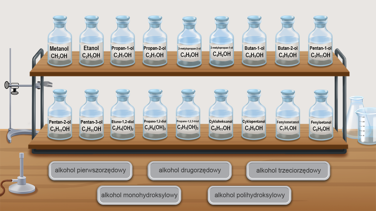 Symulacja interaktywna przedstawia półkę z 18 szklanymi butelkami. Na każdej widnieje etykieta z zawartą nazwą związku oraz wzorem sumarycznym. Alkohole pierwszorzędowe: metanol CH3OH, etanol C2H5OH, propan‑1-ol C3H7OH, 2‑metylopropan‑1-ol C4H9OH, butan‑1-ol C4H9OH,pentan‑1-ol C5H11OH, fenylometanol C7H7OH, fenyloetanol C8H9OH. Alkohole drugorzędowe: propan‑2-ol C3H7OH, butan‑2-ol C4H9OH, pentan‑2-ol C5H11OH, pentan‑3-ol C5H11OH, cykloheksanol C6H11OH, cyklopentanol C5H9OH. Alkohol trzeciorzędowy: 2‑metylopropan‑2-ol C4H9OH. Alkohole monohydroksylowe: metanol CH3OH, etanol C2H5OH, propan‑1-ol C3H7OH propan‑2-ol C3H7OH, 2‑metylopropan‑2-ol C4H9OH, 2‑metylopropan‑1-ol C4H9OH, butan‑1-ol C4H9OH, butan‑2-ol C4H9OH, pentan‑1-ol C5H11OH, pentan‑2-ol C5H11OH, pentan‑3-ol C5H11OH, cykloheksanol C6H11OH, cyklopentanol C5H11OH, fenylometanol C7H7OH, fenyloetanol C8H9OH. Alkohole polihydroksylowe: etano‑1,2‑diol C2H4OH2, propano‑1,2‑diol C3H6OH2, propano‑1,2,3‑triol C3H5OH3.